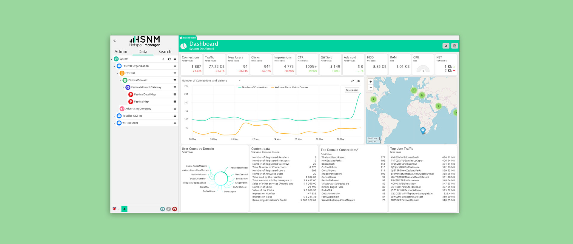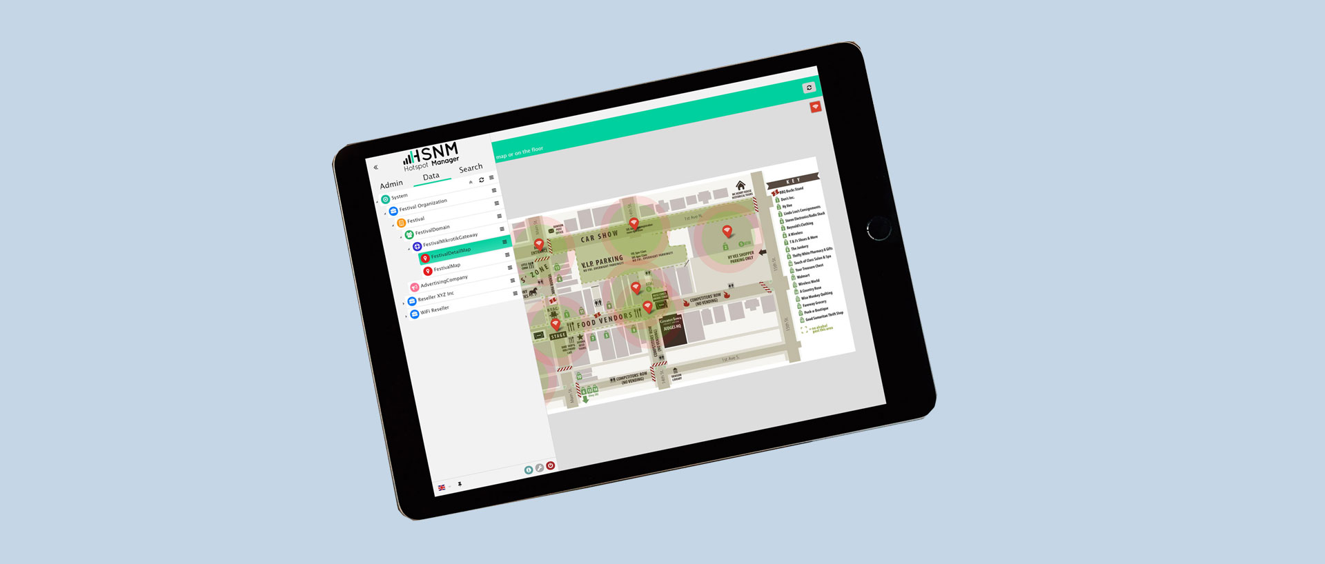 Mit dem HSNetworkmanager bietet der italienische Hersteller PROMETEO SRL eine umfangreiche Captive Portal Lösung als zeitgemäße Ergänzung von Hotspotsystemen unterschiedlichster Hersteller, wie z. B. MikroTik oder LigoWave, an. Der HSNetworkmanager verwaltet Hotspotsysteme zentral. Er ist dabei mandantenfähig und erweitert statische Landing Pages um dynamische Inhalte. Schnittstellen zu verschiedenen Zahlungssystemen, SMS-Gateway und die Anmeldung über Social Media sind integriert.
